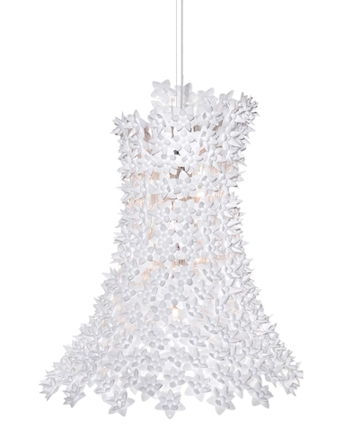 Bloom is a tubular polycarbonate framework entirely covered by a structure of tiny transparent polycarbonate double corolla flowers. The result is an industrially produced lamp but with all the forms and stylistic complexity of a unique handcrafted piece.