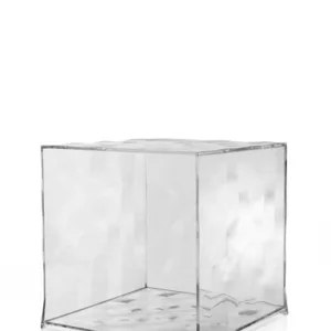 Optic is a container cube which comes in two versions: closed with a door or with one open side. Its surface is strikingly decorated with square based transparent or mirrored pyramids, slightly in relief, which create a strong visual impact. Optic measure